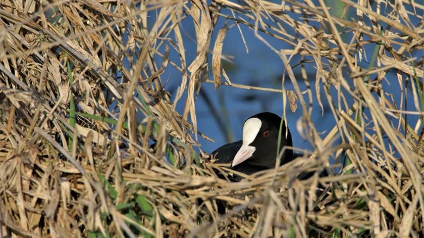 Plots moest ik lachen, want ik ontdekte deze meerkoet die “goed gecamoufleerd” achter een grote pluk gras zat en door een gat in de “camouflage” naar de weg keek. Zou ze zich veilig gevoeld hebben?. Heeft ze gemerkt dat ik haar had gezien en haar ijverig fotografeerde?