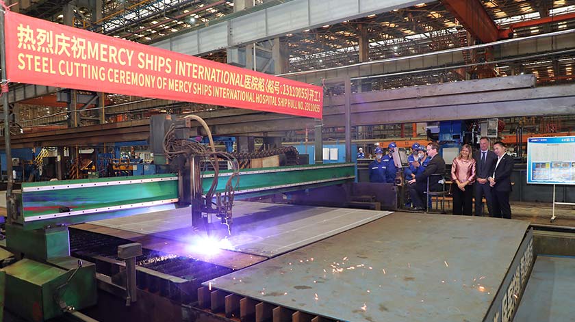 Mercy Ships is begonnen met de bouw van een nieuw ziekenhuisschip. De zogeheten steel cutting ceremony op de werf in Guangzhou (China) markeerde de start van de bouw van een gloednieuw ziekenhuisschip, de Africa Mercy II. Het doel voor uitbreiding van de vloot komt voort uit de wens om meer capaciteit te ontwikkelen voor chirurgische zorg in Afrika. Foto: Het eerste staal voor de Africa Mercy II wordt gesneden