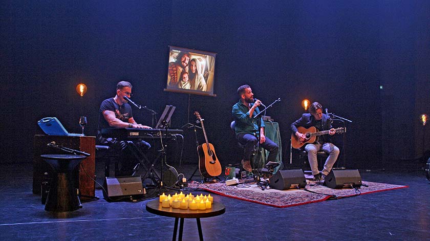 “We gaan een spoor van licht volgen vanavond”, vertelt Maasland na het eerste lied. “Ik ben een domineeszoon, dus ik gebruik drie punten in mijn preek vanaf het podium. We kijken eerst naar het licht van toen. Daarna richten we onze aandacht op het licht van vandaag en tenslotte op het licht van morgen. Ik wil jullie uitdagen dit licht niet voor jezelf te houden, maar dit te delen. Begin daar vandaag mee met het lichtje dat jullie bij de ingang van de zaal kregen.” De zaal verandert in een lichtspel. Op het podium staat een oude diaprojector. Lichtbeelden ondersteunen Maaslands verhaal. Hij gaat 2000 jaar terug in de tijd naar de kerststal, maar ook naar zijn eigen kindertijd. “We speelden in ons gezin eeuwenoude kerstliederen en lazen het kerstverhaal uit de bijbel.” Hij leest het nu uit het boek Mattheüs voor. Daarna zet hij ‘Halleluja Christ Is Born’ en ‘What Child Is This / Child Of The Poor’ in. De melodie van ‘What Child Is This’ heeft hij aangepast om de melodieën beter in elkaar over te laten vloeien.
