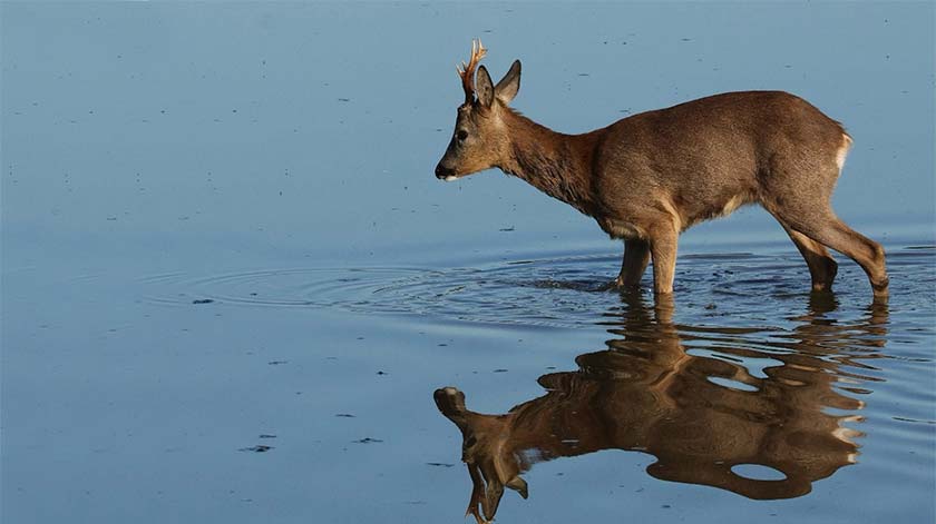 Ik had een ander ree geobserveerd en ook enkele foto’s gemaakt. Toen ik uiteindelijk mijn camera neerlegde, zag ik het ree vlak voor de observatiehut waar ik net zat! Het had mij niet opgemerkt en trok na enkele ogenblikken rustig en zonder haast door het kleine vijvertje voor de hut weg. Ik had nog nooit gezien dat een ree zo door het water waadde! En ik moest al snel denken aan een vers uit de profeet Jesaja, uit hoofdstuk 43, vers 2: