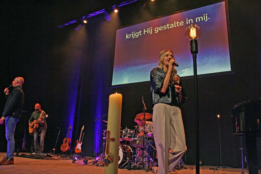 Christelijk Nieuws was op woensdagavond 25 maart bij het concerten in de Basiliek in Veenendaal. Op het podium stond een mooie, grote Paaskaars. Sela startte in het donker. Eén van de eerste liederen die klonk, was het indrukwekkende ‘Blaas In Ons’ over de doden die opstaan in het visioen in Ezechiël 37: “Graven gaan open, de doden staan op, halen weer adem, adem van God.”