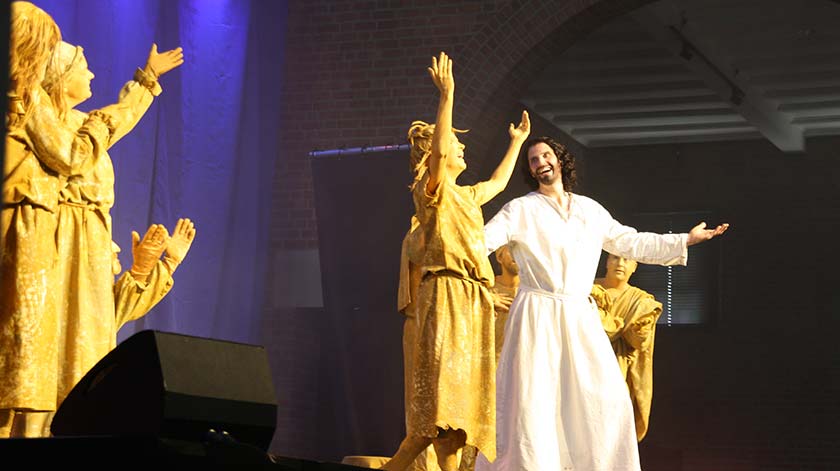 Het theaterstuk bestaat uit diverse scènes die deels buiten en deels binnen opgevoerd worden. Zo staan er beelden op lage en hoge sokkels die aspecten van Jezus’ werk uitbeelden of uitspraken van hem. Denk aan: “Ik ben het licht van de wereld.”