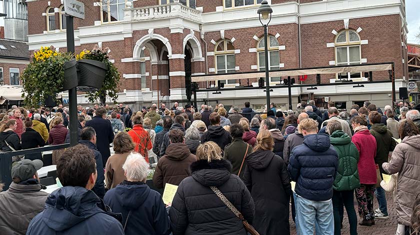 Als je aankomt op het Raadhuisplein, hoor je het carillon al paasliederen spelen. Het korps van het Leger des Heils speelt muziek. Wanneer je het plein opgaat, word je begroet met ‘De Heer is waarlijk opgestaan’ en je ontvangt een liturgie. Frieda Hanouwer heet iedereen welkom. Hester Smits houdt een korte toespraak. Bekende liederen die gezongen worden: Daar juicht een toon, Jezus leeft in eeuwigheid, Christus onze Heer verrees, Kroon Hem met gouden kroon en U zij de glorie. Gé Drayer sluit het event af met een korte toespraak en het gezamenlijk bidden van het ‘Onze Vader’.